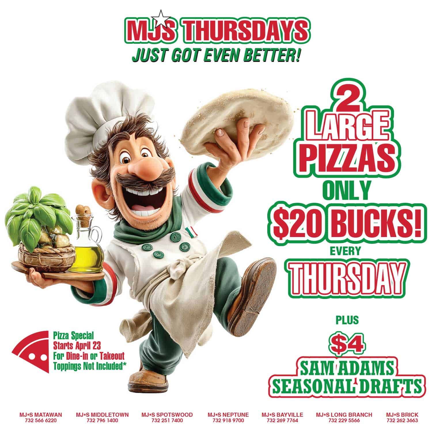 TWO PIZZAS FOR 20 BUCKS THURSDAYS